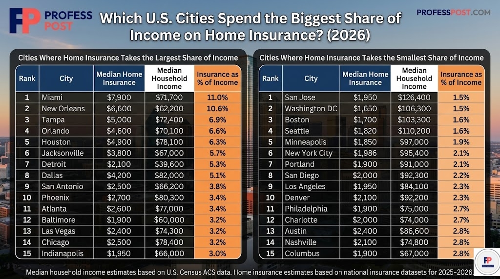 30 Major U.S. Cities Ranked by Home Insurance as a Share of Household Income (2026)