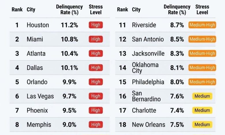 This analysis breaks down the 20 major U.S. cities experiencing the highest levels of financial stress, using a combination of delinquency trends, debt patterns, and income pressure.