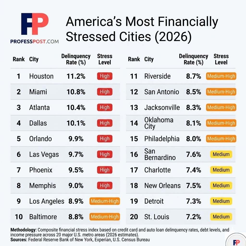 This analysis breaks down the 20 major U.S. cities experiencing the highest levels of financial stress, using a combination of delinquency trends, debt patterns, and income pressure.