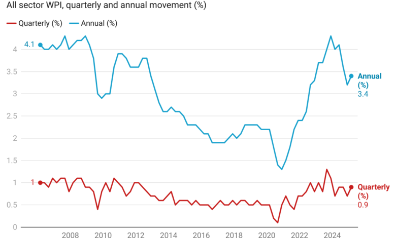 This pushed the annual growth rate of the Wage Price Index (WPI) from 3.2% to 3.4% over the same period.