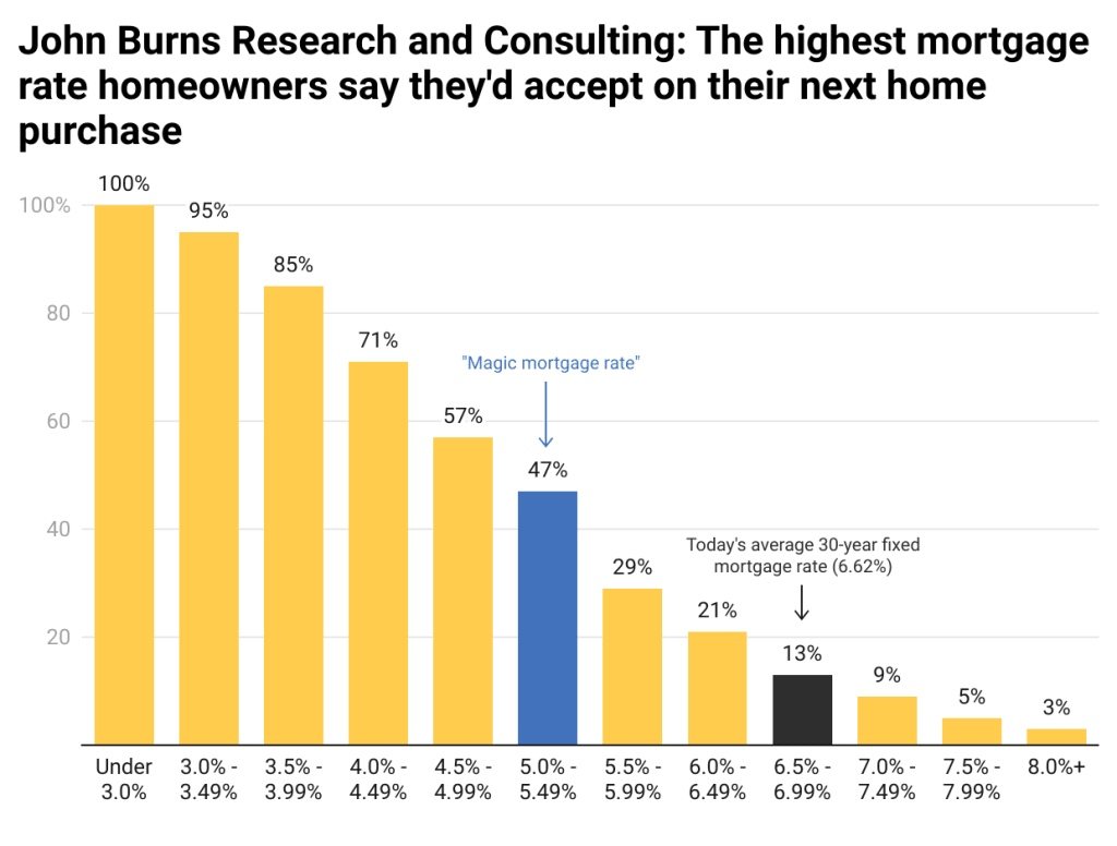 A recent survey conducted by John Burns Research and Consulting (JBREC) reveals that neither the 6.11% mortgage rate nor the current 6.62% rate is sufficient to encourage homeowners to sell their properties. Many are choosing to stay in their homes due to the influence of mortgage rates.