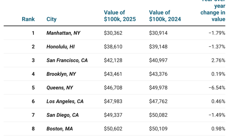 In Manhattan, NY, a $100,000 salary stretches the least, offering just $30,362 in effective spending power. This sharp decline is due to high federal and local taxes, coupled with a cost of living that’s 130.6% above the national average. Adjusted for inflation, last year’s value was slightly better at $30,914. Following Manhattan, the cities where $100,000 goes the least far are Honolulu, HI, with $38,609 in purchasing power, and San Francisco, CA, at $42,128.