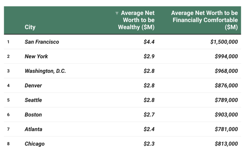 San Francisco leads the pack, with locals saying it takes a net worth of $4.4 million to be considered wealthy.