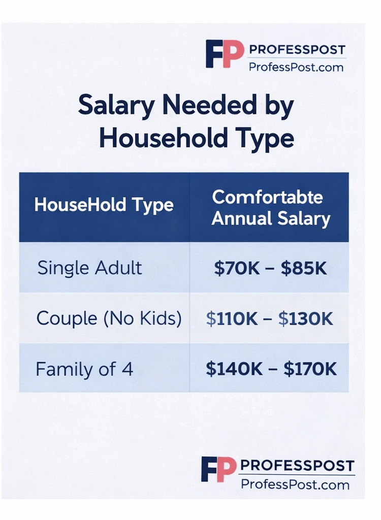 However, comfortable living requires room for savings, emergencies, retirement contributions, and lifestyle flexibility — which pushes the recommended salary into the $70K–$85K range