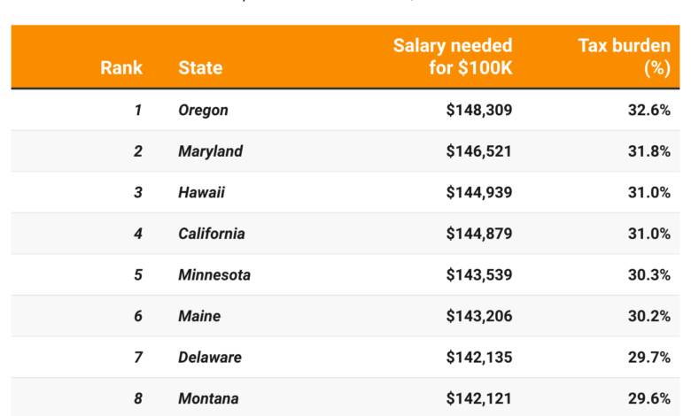 The five states where you need the highest salary to take home $100,000 after taxes are Oregon, Maryland, Hawaii, California, and Minnesota. To net that amount, your income must range from $143,539 in Minnesota to $148,309 in Oregon.