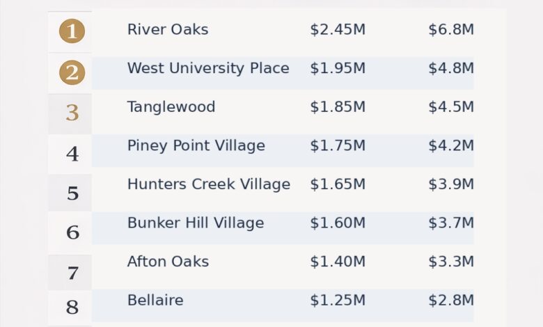 | 5 | Hunters Creek Village | $1.65M | $3.9M |