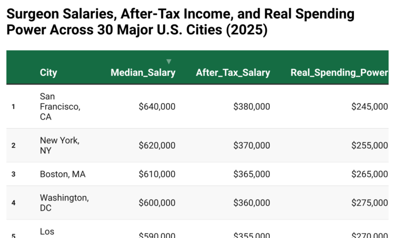 This ranking breaks down surgeon salaries in 30 major U.S. cities and adjusts them for after-tax income and real spending power. If you want to know where surgeons make the most money in 2025 — and more importantly, where they keep the most — this data tells the full story.