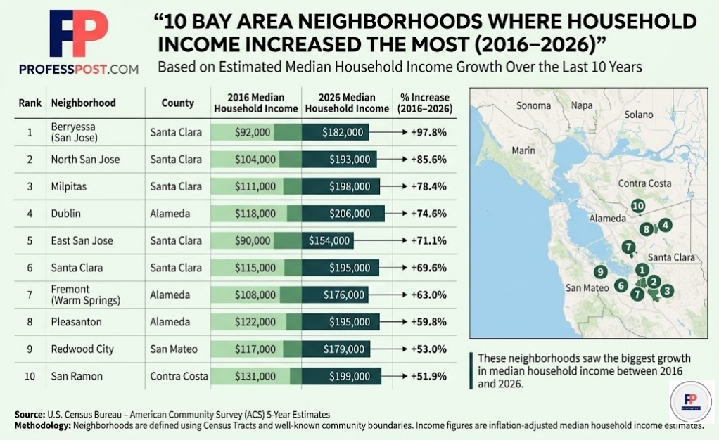 Between 2016 and 2026, a new class of “fast-richening” neighborhoods emerged across Santa Clara County, Alameda County, San Mateo County, and parts of Contra Costa County. These were not always the most expensive ZIP codes, but they became some of the strongest income-growth zones in the region thanks to tech expansion, RSU wealth, AI hiring, BART expansion, remote work migration, and housing spillover from San Francisco and the Peninsula.