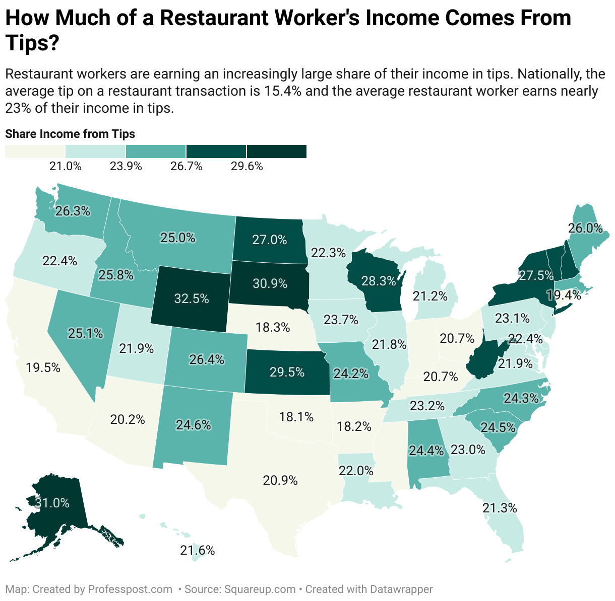 Given these wage structures, it’s no surprise that tips make up the largest portion of restaurant workers’ earnings in Wyoming, where tips account for an average of 33% of their income, according to data from Square.