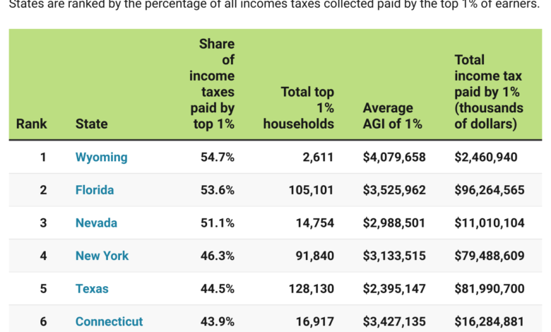 - In three states, the top 1% of earners provide more than half of all income tax revenue. Wyoming leads the nation, with just 2,611 top-earning households supplying 54.7% of the state’s total income tax collections. Florida ranks second, where 105,101 top-income households contribute 53.6% of all income tax revenue. Nevada follows in third place, with its 14,754 highest-earning households accounting for 51.1% of the state’s income tax total.