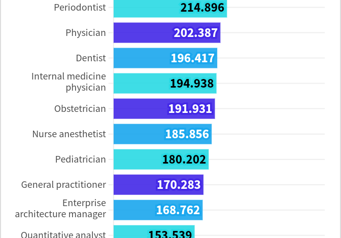 Healthcare holds the majority of top-paying positions, with 13 out of the 20 highest-paying occupations belonging to this field. Outside of healthcare, enterprise architecture managers rank among the highest-paid professions.