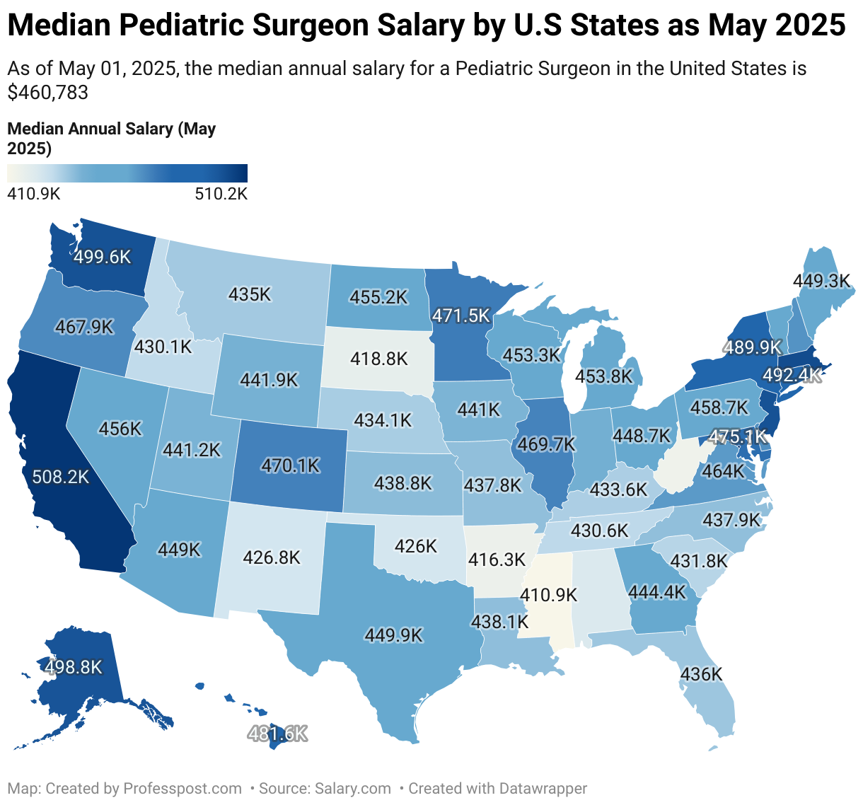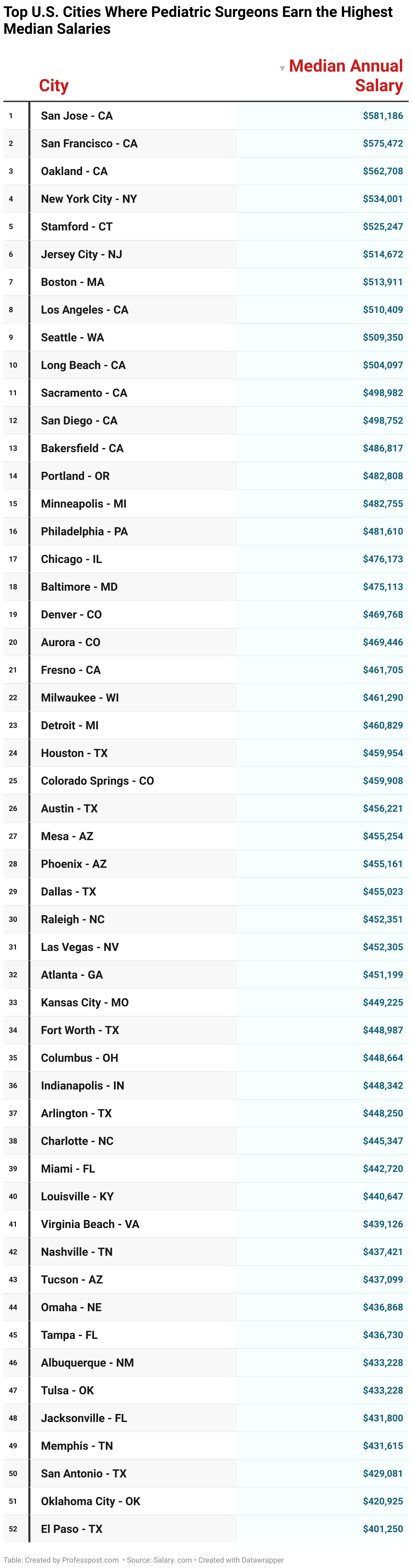 Texas cities such as Houston ($459,954), Austin ($456,221), and Dallas ($455,023) show strong median salaries for pediatric surgeons, reflecting the state’s growing healthcare infrastructure and population.